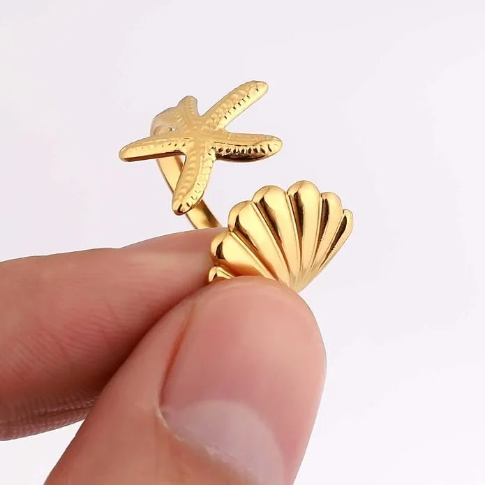 Stainless Steel Golden Starfish & Shell Ring