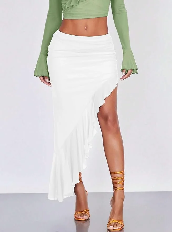 High Waisted Asymmetrical Ruched Ruffle Trim Midi Long Skirt