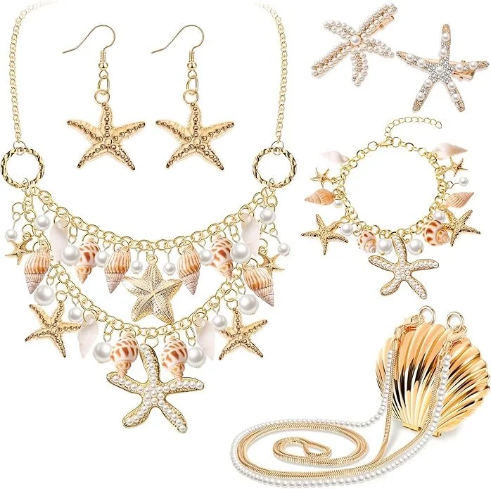 6 Pc Set - Starfish Earrings, Hair Clips, Bracelet, Necklace, Purse