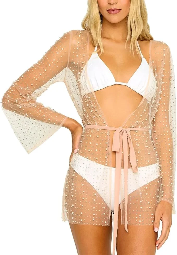 Mesh Pearl Rhinestone Cardigan Cover-Up