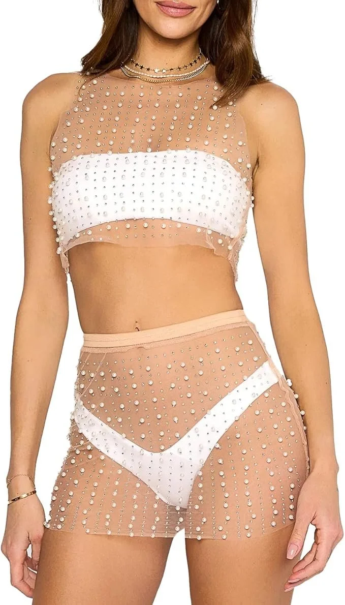 2 Pc Mesh Pearl Rhinestone Cropped Mini Skirt Cover-Up Set